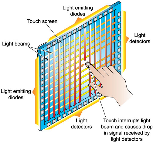 如下图所示,触摸屏是在显示器的前面安装一个外框,外框里设计有电路板,从而在屏幕四边排布红外发射管和红外接收管,一一对应形成横竖交叉的红外线矩阵。每扫描完一圈,如果所有的红外对管通达,表示一切正常并未有触摸。当有触摸时,手指或其它物就会挡住经过该坐标位置的横竖红外线,X或Y轴触摸屏扫描时发现并确信有一条红外线受阻后,表示可能有触摸,同时立刻换到另一轴坐标再扫描,如果再发现另外一轴也有一条红外线受阻,表示发现触摸,经过计算判断出触摸点在屏幕的位置。
